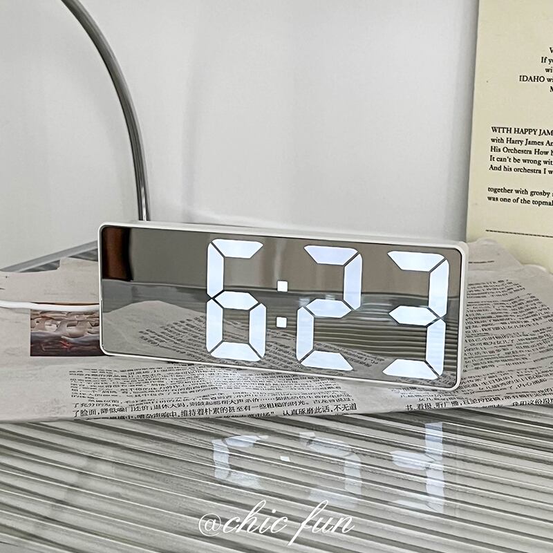 ミラー表示 デジタル目覚まし時計は、洗練されたデザインと見やすいデジタル表示が魅力です。モダンな部屋にぴったりなミラー仕上げがお部屋をさりげなく演出し、デジタル表示は大きくクリア。シンプルながらも機能性も十分に備え、朝の目覚めをスムーズにサポートします。