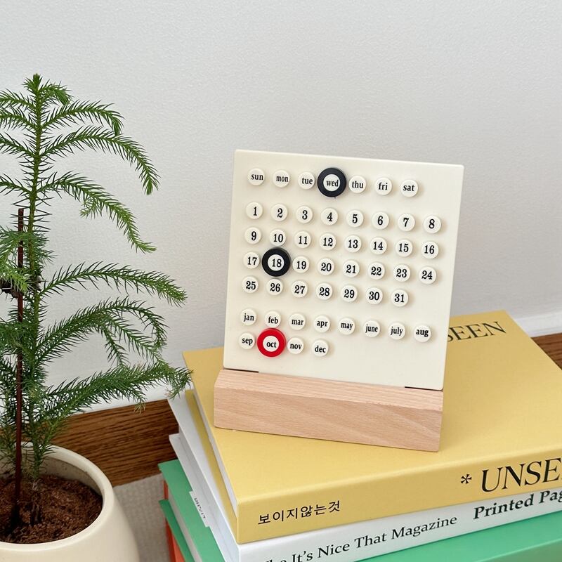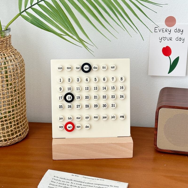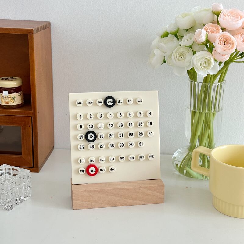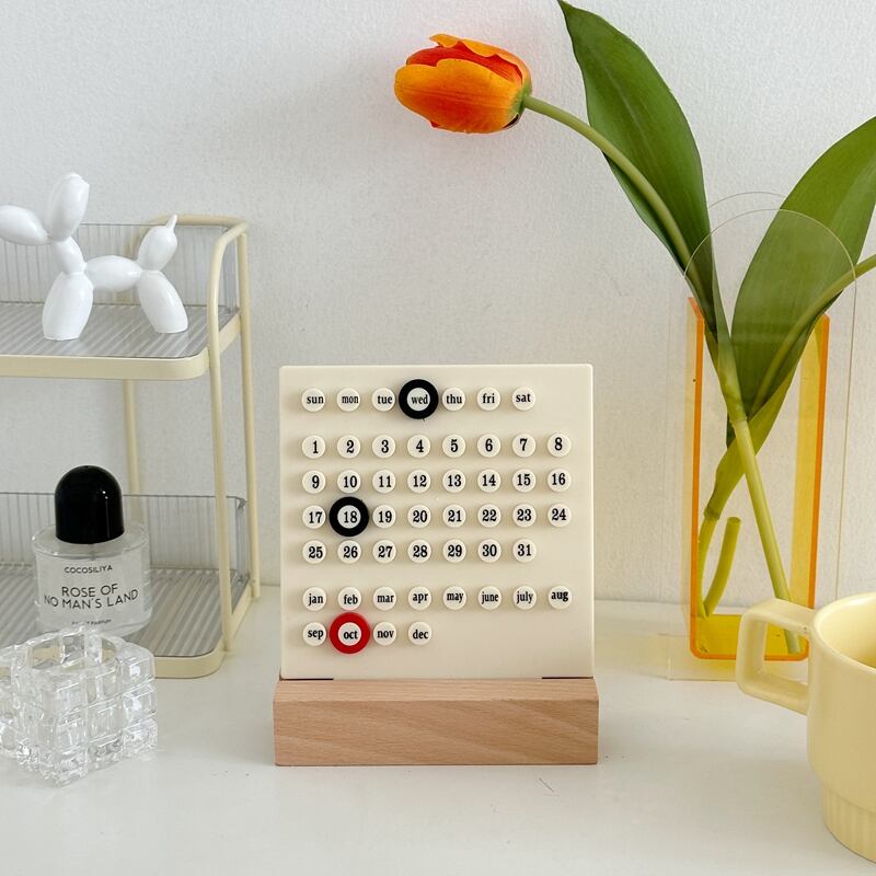 シンプルでおしゃれなデザインが特徴の永久カレンダーです。クリーム色のアクリル製カレンダープレートにリングをはめ込んで使用するだけで、週、日付、月がスッキリと表示されます。木製の台も素材感があり、インテリアに馴染むアイテムです。