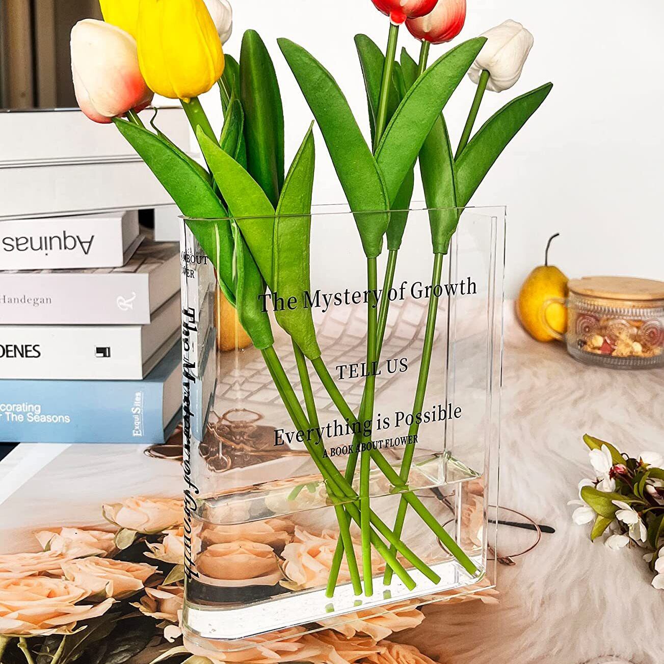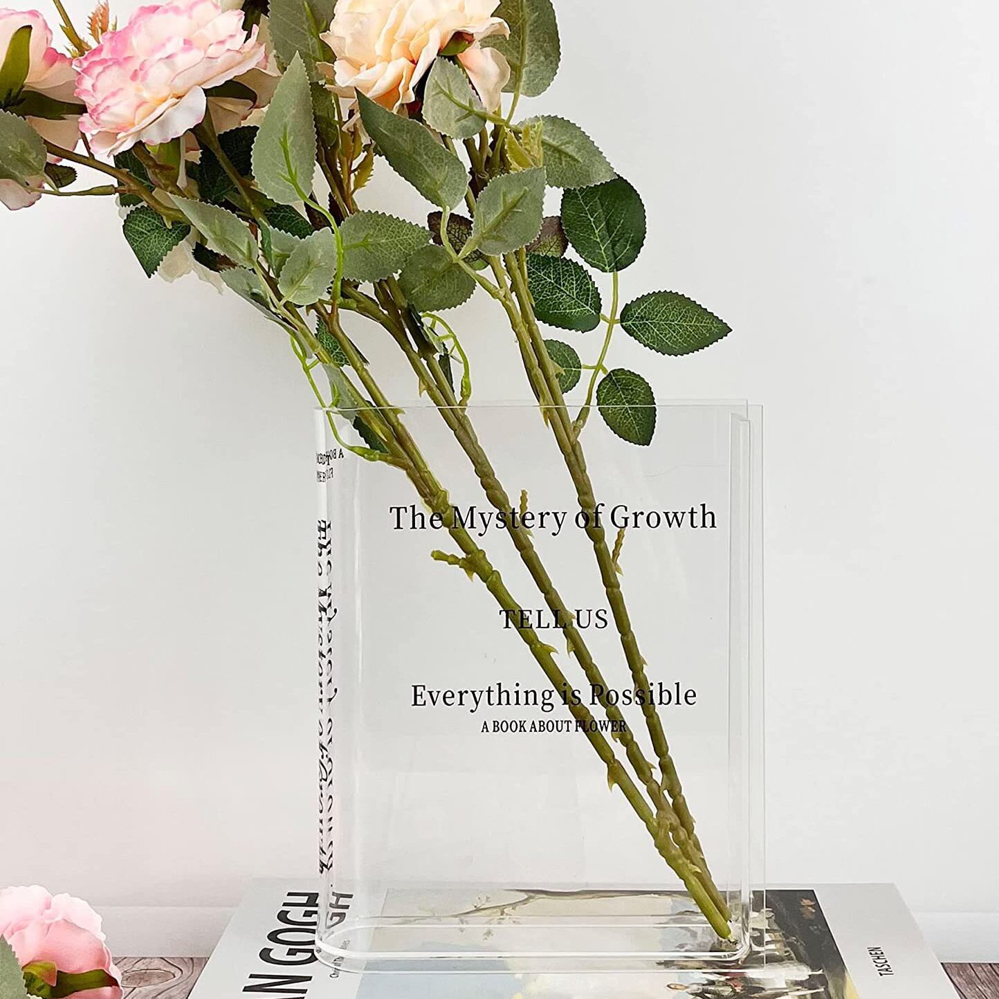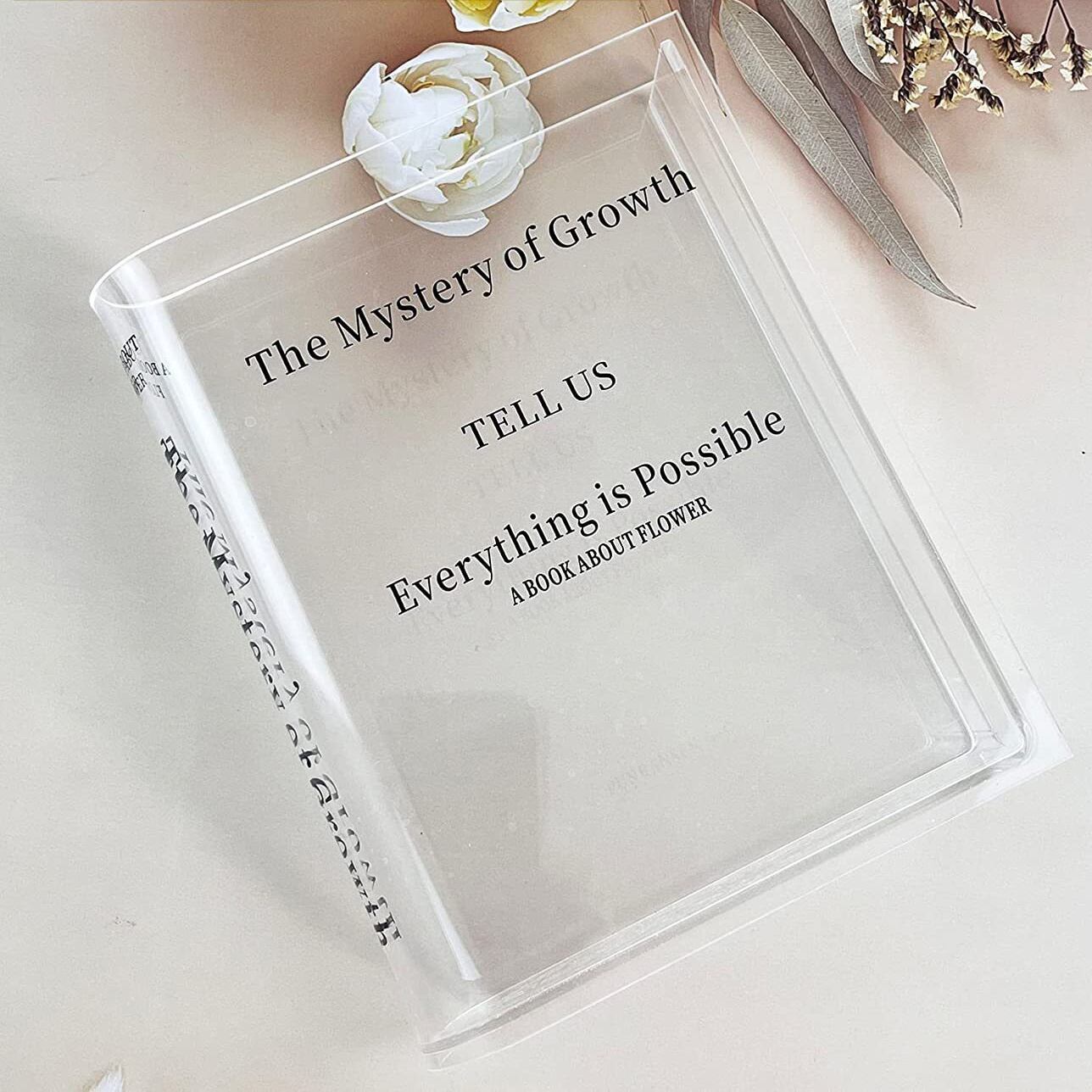 透明なアクリル花瓶は、お部屋を明るく演出するアイテムとして大活躍間違いなし。上製本の形を模したデザインで、おしゃれなインテリアの一部としてもおすすめです。玄関やリビングルームなど、どんな場所にもマッチするスタイリッシュな花瓶です。