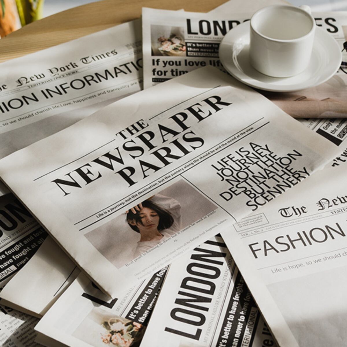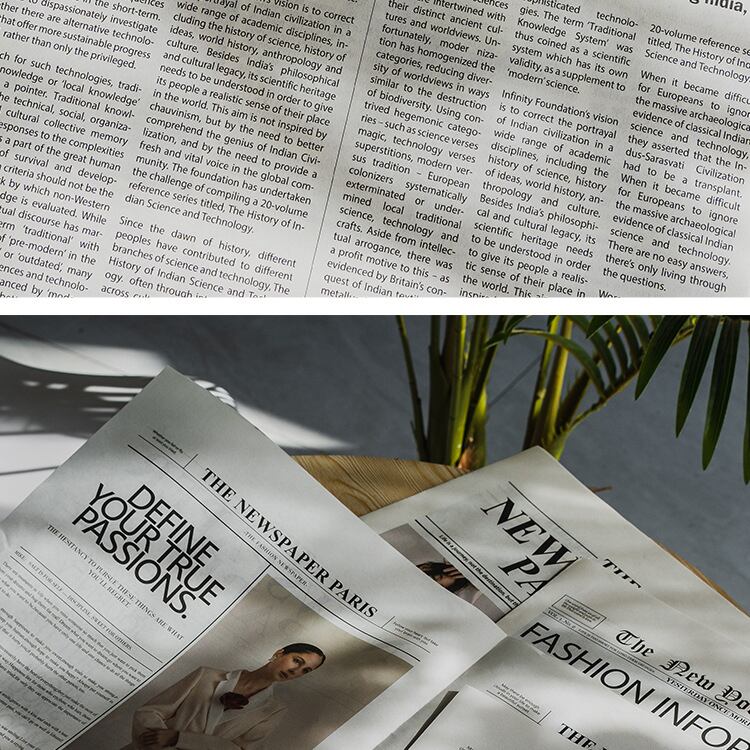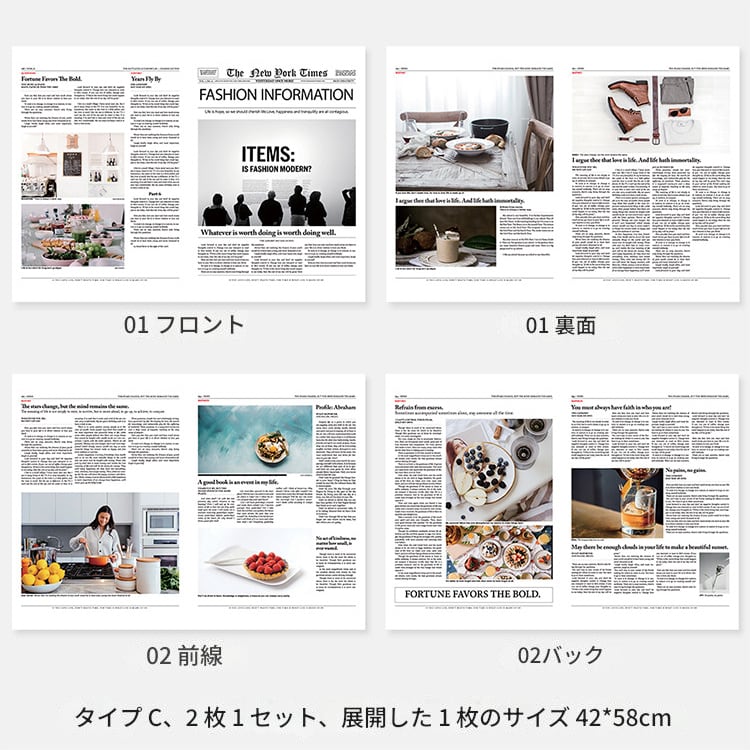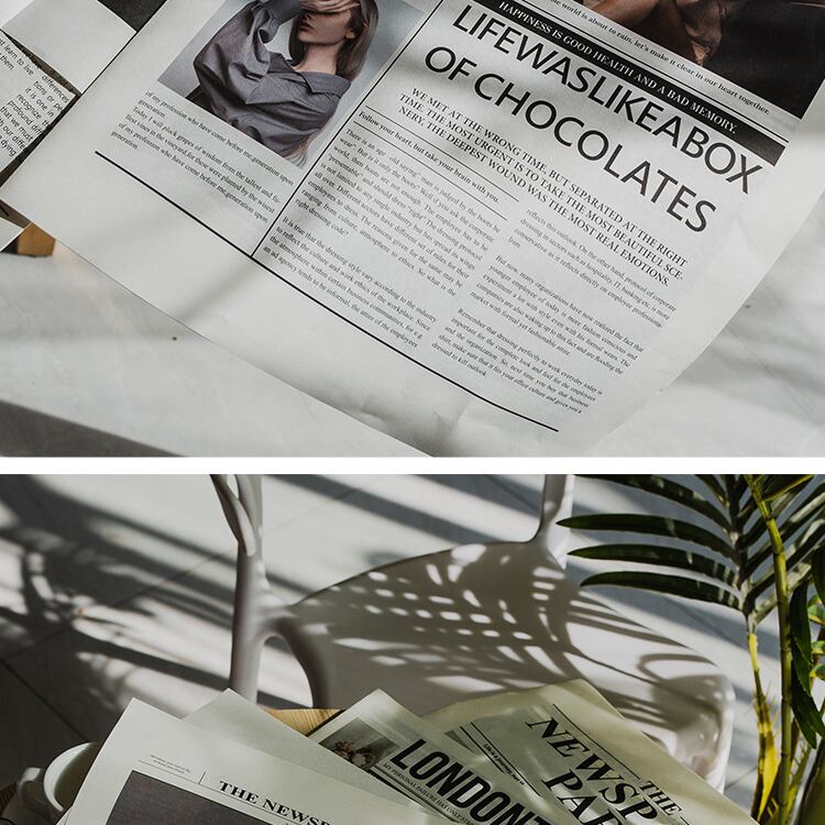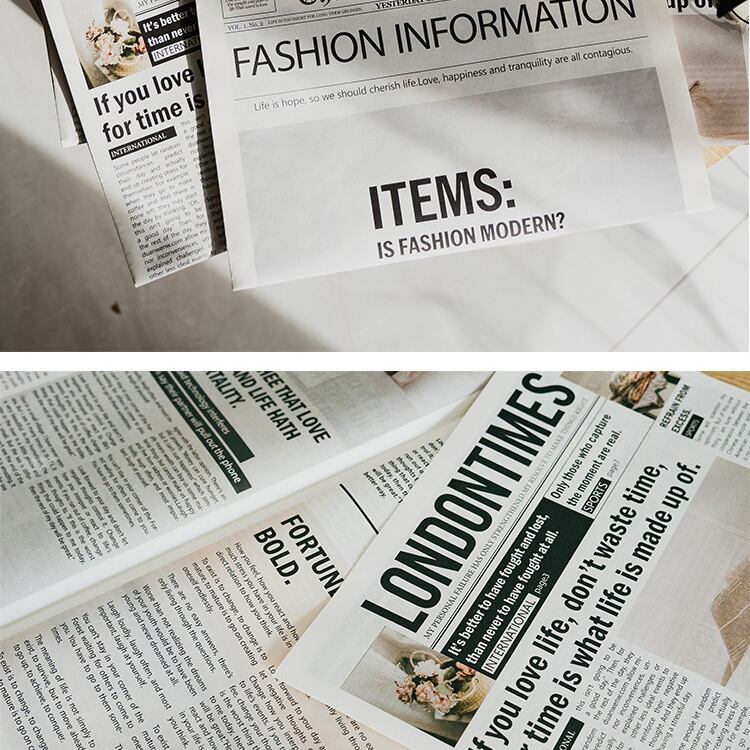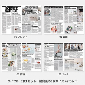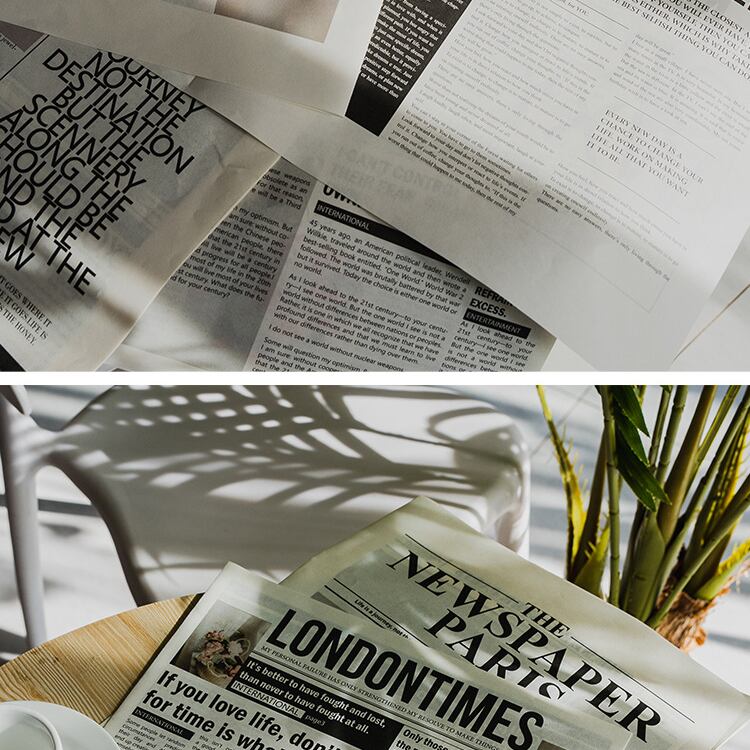 シンプルな英語の新聞です。写真入りで雰囲気良く、ポートレート、料理、化粧品などのライブ撮影に適しています。英字新聞はご家庭のインテリアとしても活躍します。2冊で1セットになります。 ーSizeー 42x58cm ーVariationー ・TypeA 2冊入 ・TypeB 2冊入 ・TypeC 2冊入 《発着期間》 10日から14日を予定しておりますが、当商品は海外からお取り寄せさせていただいておりますので、状況によってはお時間をいただく可能性がございます。 [ご注文前に必ずお読みください] https://korano.official.ec/about ○英字新聞の装飾用背景紙です。シックでおしゃれなデザインが、ポートレートや料理、商品撮影にぴったりです。お部屋のインテリアとしてもさりげなく彩りを添えます。 ○様々なシーンで活躍する英字新聞は、撮影の小道具としても理想的です。自然光を浴びて、その質感が映えるので、特にインスタグラムなどのSNS映えを狙う場合におすすめです。 ○お部屋の壁にかけたり、テーブルの上に敷いたりすることで、個性的な装飾を楽しむことができます。友人や家族が集まる場所に、より洗練された雰囲気を加えてくれることでしょう。 ※英字新聞は折りたたんだ状態で発送されます。